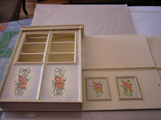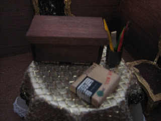 Como os habréis dado cuenta las sillitas están faltas de tapizado, van tapizadas con seda igual que la mesilla, al espejo le falta cristal. Y bueno la cajita con puntillas, el baulito de escritor (fue mi primera miniatura, hace 14 años, le tengo cariño, pero sinceramente, me apetece que aparezca en la escena, así que suerte a quien le toque).